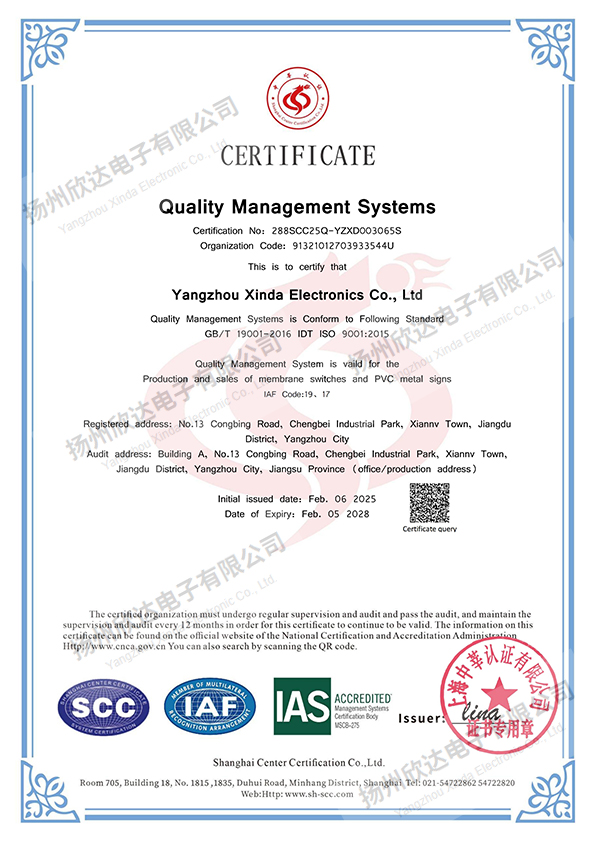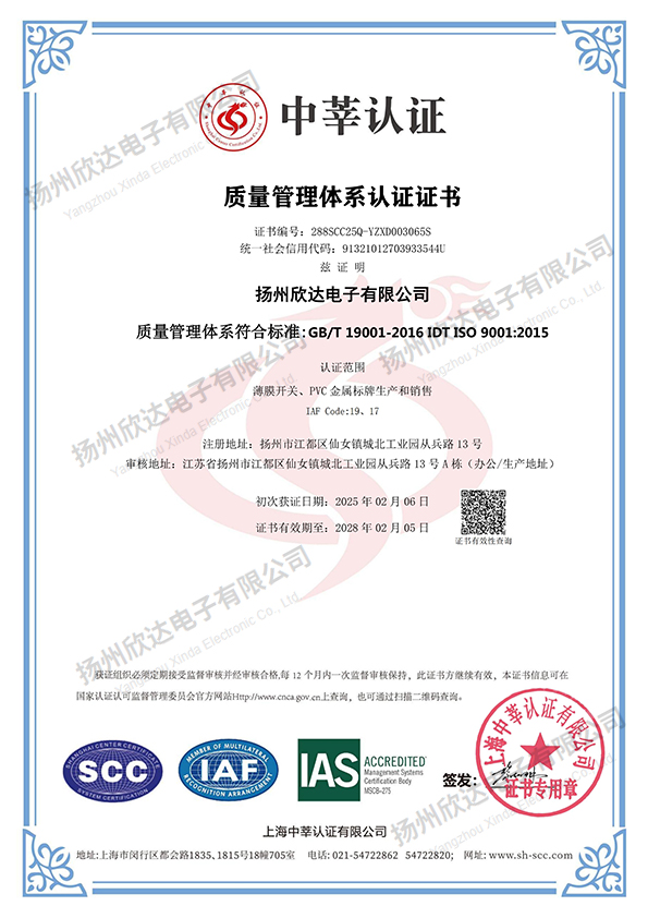 揚州欣達電子有限公司是一家從事電子輕觸薄膜開關,薄膜面板及PVC、金屬標牌,不干膠貼,噴塑、烤漆絲印面板等各種絲印工藝的有限責任公司。公司位于風景秀麗的文化名城江蘇揚州市江都區。自1993年建廠以來,我們致力于信譽至上,顧客為首的原則,及時為廣大客戶提供合格滿意的產品:堅持著質量為首,持續改進的方針,狠抓品質管理,取得了客戶的認可:履行著誠信、互惠的宗旨,贏得了客戶的支持和信任。目前公司擁有先進的絲網印刷設備,熟練的業務技術骨干和嶄新適用的廠房,每年為全國各地的客戶提供數億的合格產品。我們把“誠信、務實、求精、創新”作為我們的企業宗旨,在經營管理中貫徹“以人為本,精益求精”的經營理念;在生產管理中嚴格按ISO9001質量體系落實生產; 在為客戶服務過程中按照產品的分類提供多種設計方案,讓我們產品更好體現客戶的理念。...